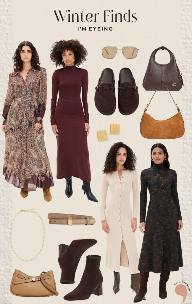 Winter is short lived here in Southern California, but I’m on the hunt to add a few more pieces to my winter wardrobe. I’m always reaching for a dress when I’m putting together an outfit, so I thought I’d share a few winter-approved dresses and accessories I’m eyeing from Shopbop! For a cozy but classic look, this floral printed turtleneck dress is a must — just pair with a knee-high boot and you’ve got an elevated winter look! You can never go wrong with a button up dress, and this cream knit dress would be perfect anytime of year. If you’re in need of a go-to pair of booties, then these dark suede Loeffler Randall booties are just the pick. I own these and absolutely love them!